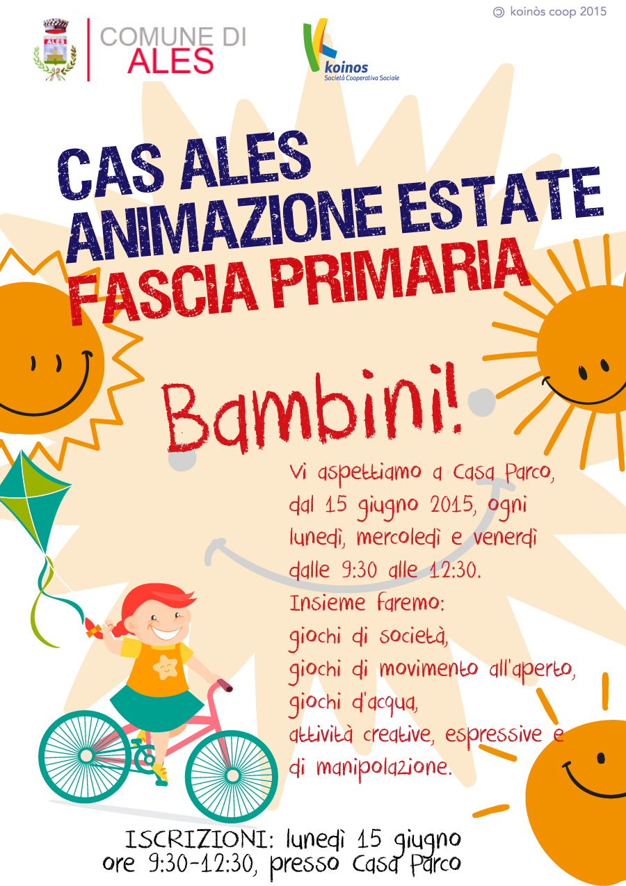 Per l’estate 2016 il Comune di Ales organizza uno spazio di animazione e aggregazione per bambini, ragazzi e adulti. Le attività si svolgeranno presso i locali di Casa Parco e saranno gestite dalla cooperativa sociale Koinòs. La partecipazione alle attività è gratuita. Per informazioni e iscrizioni rivolgersi presso Casa Parco nei giorni di attività.