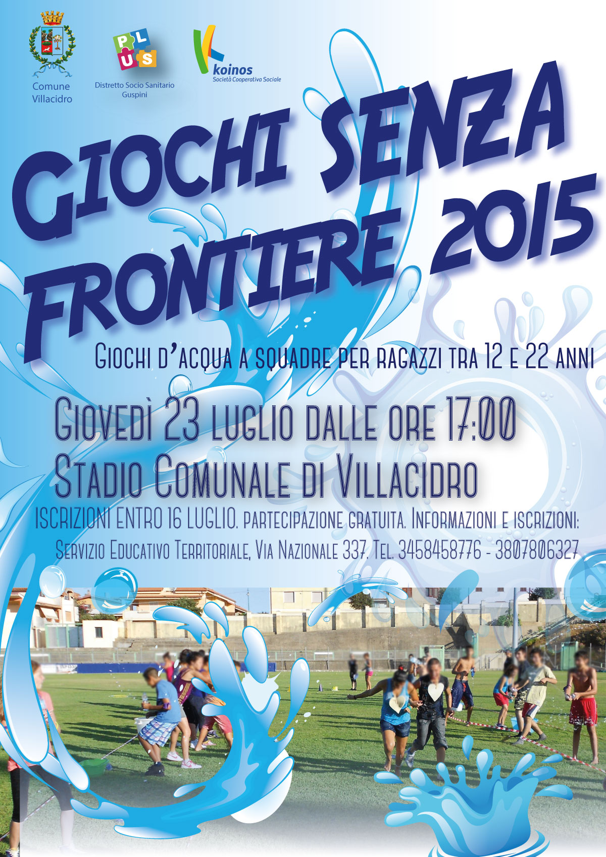 Il Comune di Villacidro, il PLUS Distretto Socio Sanitario di Guspini e la Cooperativa sociale Koinos organizzano GIOCHI SENZA FRONTIERE 2015 – Giochi d’acqua a squadre per ragazzi tra i 12 e i 22 anni.